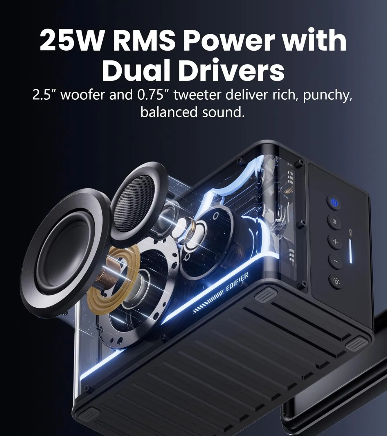 2.5" mid-bass driver and 0.75" tweeter with neodymium magnets, complemented by an oval passive radiator for enhanced sound quality
