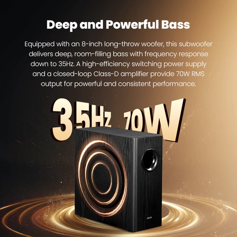 Bring your audio to life with the Edifier T5s, a powerful and compact 8” front-firing subwoofer designed to deliver rich, room-filling bass down to 35Hz. Ideal for desktop setups, bookshelf speakers, or home theaters, the T5s packs performance, precision, and style into one slim vertical cabinet.