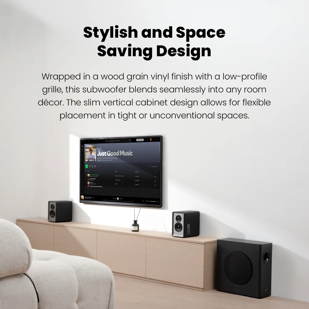 Compact & Stylish – Slim vertical form factor with wood grain vinyl finish