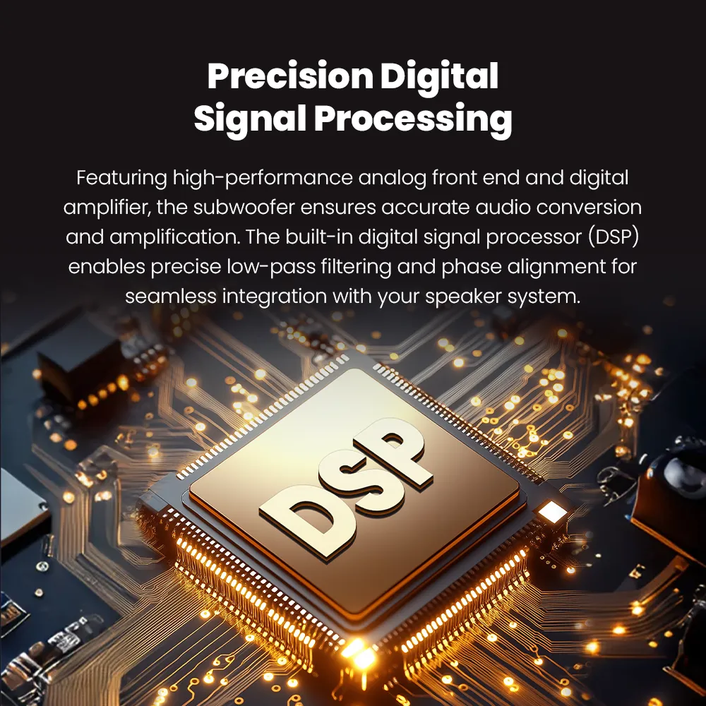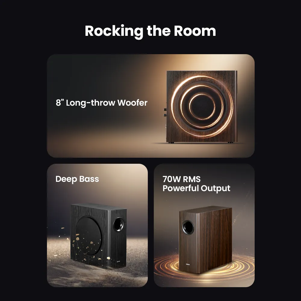 8” Long-Throw Woofer – Front-firing design for immersive deep bass