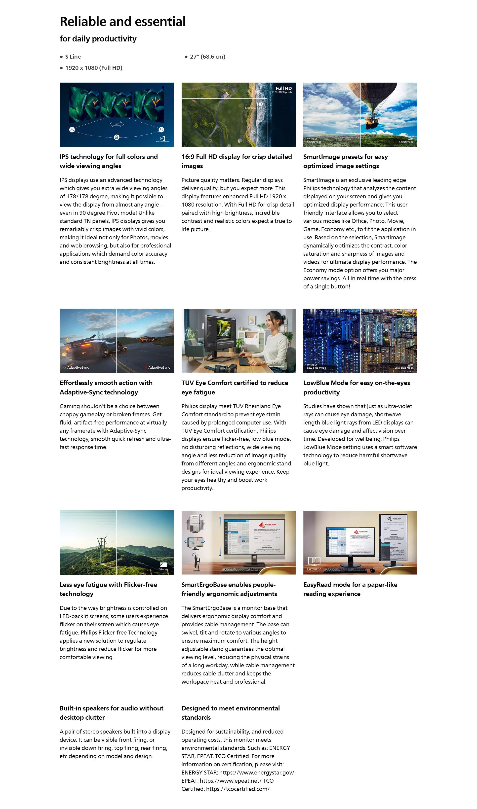 Philips S Line monitor gives essential features for daily productivity and work comfortably. Virtually frameless with crisp FHD for an expended and clear view. EasyRead and Eye comfort with TUV certified to reduce eye fatigue.
