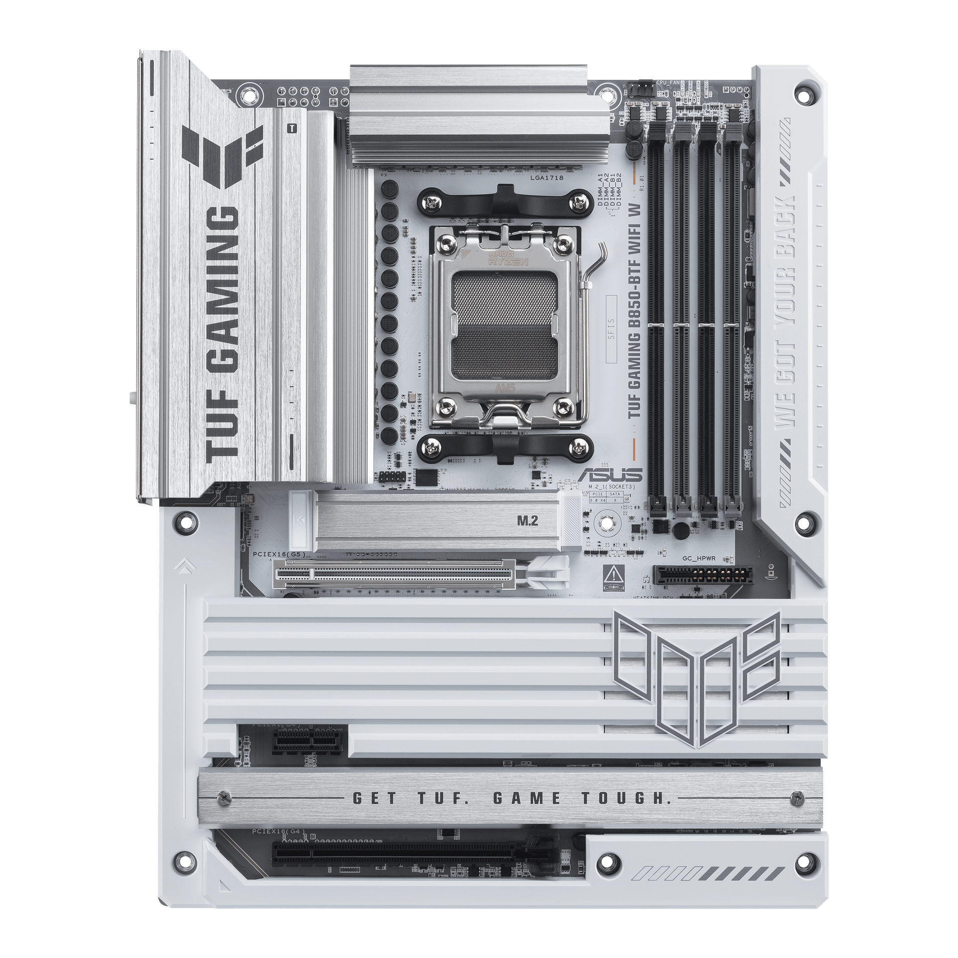 TUF GAMING B850-BTF WIFI W takes all the essential elements of the latest AMD Ryzen™ processors and combines them with game-ready features and proven durability. “BTF” means “Back To (the) Future” for a new era for all PC DIY gamers; the advanced BTF series not only hides all its connectors on the underside of the motherboard, but it also delivers up to 600 watts for BTF graphics cards through a graphics card high-power slot, for clean cable management and a minimalist build appearance. This platform delivers the power and connectivity that advanced AI PC applications demand.