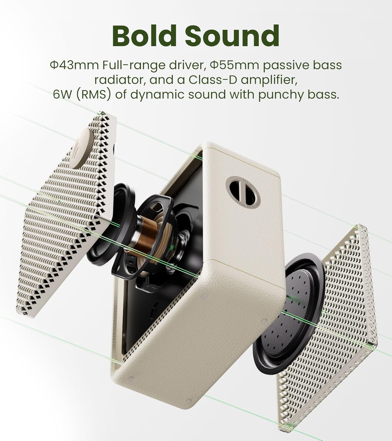 - PREMIUM SOUND QUALITY - Experience rich, immersive audio with 6W (RMS) output power and a 1.7'' (43mm) full-range driver enhanced by 2'' passive bass radiators. It delivers a rich, punchy sound with deep lows and crisp highs. Perfect for music lovers who demand high-quality sound in a compact, portable design.