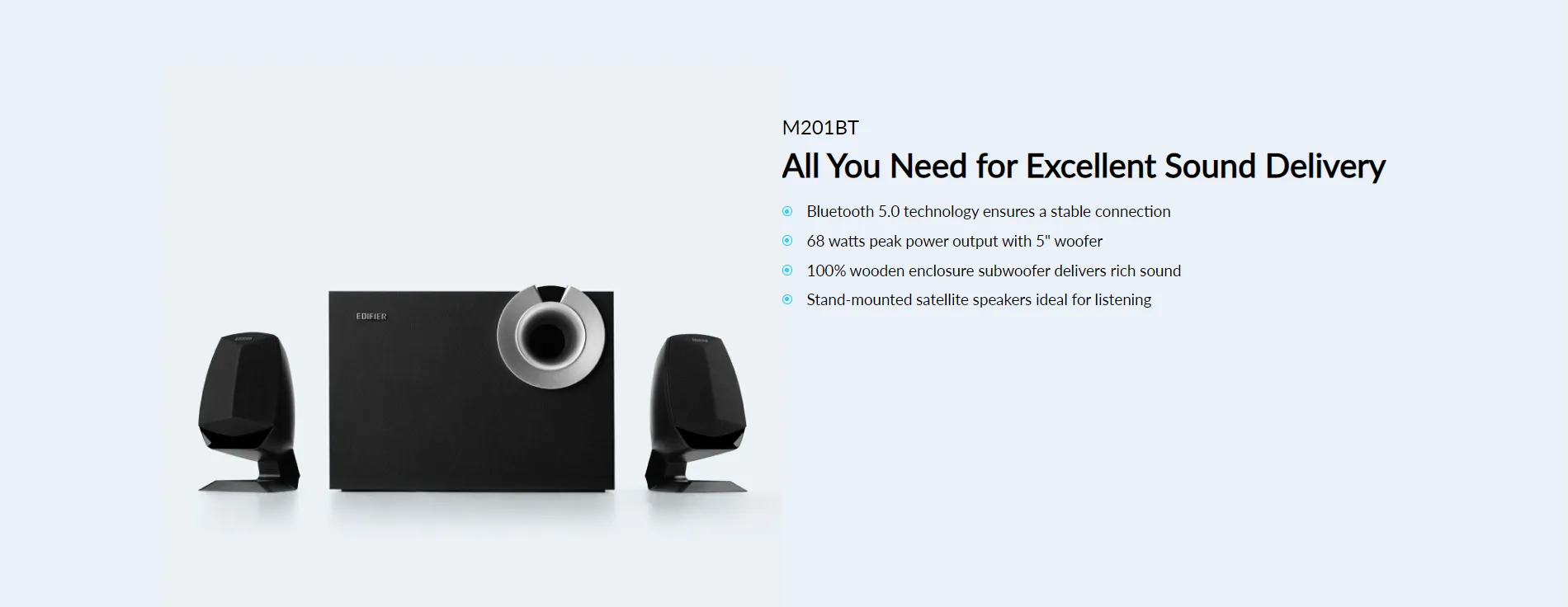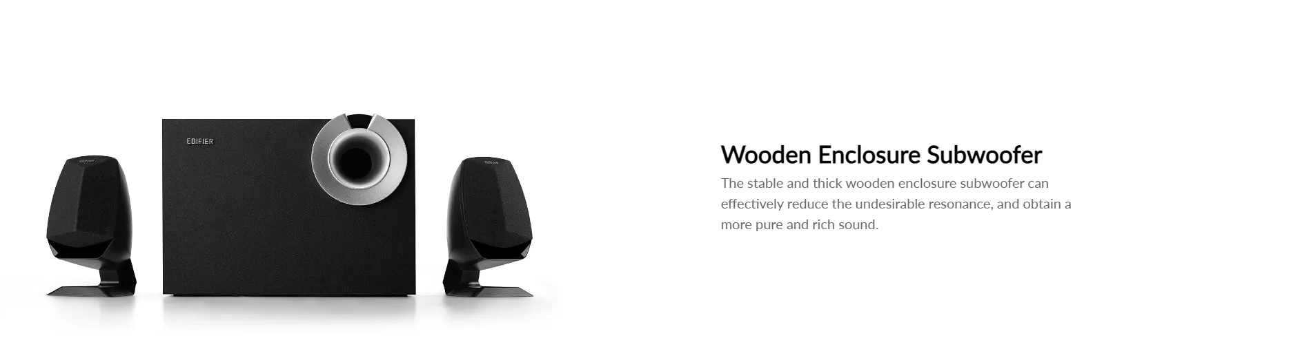 The system includes two 84×153×103mm / 3.3-inch x 6-inch x 4-inch satellite speakers and one 161×200×280mm / 6.3-inch x 7.87-inch x 11-inch 5" subwoofer with 68 watts peak power output to create a wide and full sound audio experience. The stable and thick wooden enclosure subwoofer can effectively reduce the undesirable resonance, and obtain a more pure and rich sound.
