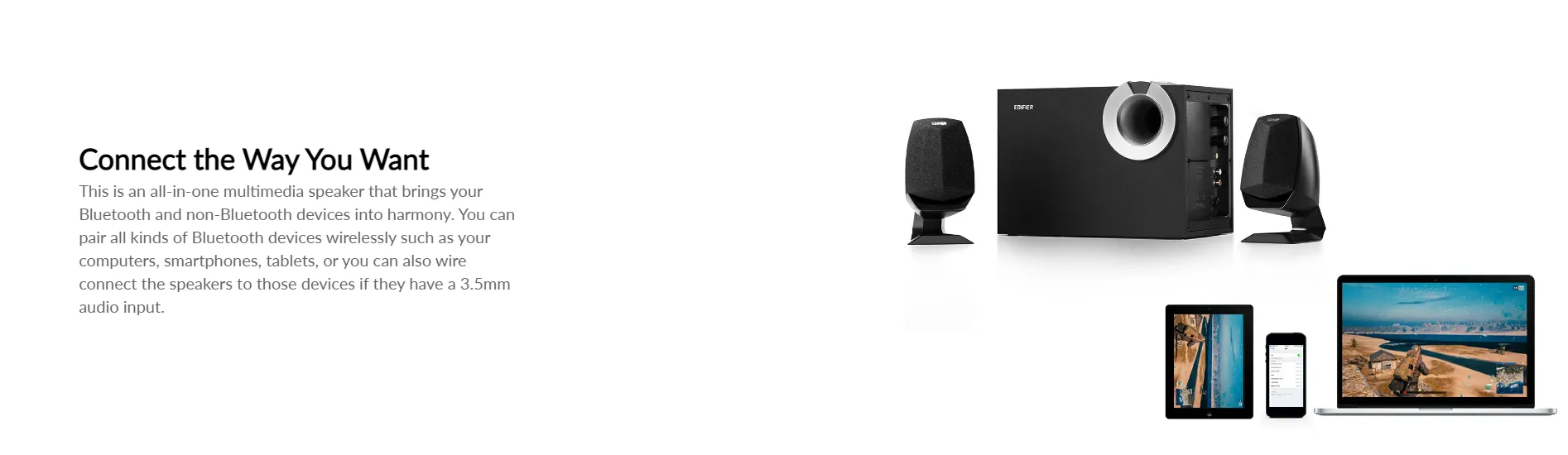 This is an all-in-one multimedia speaker that brings your Bluetooth and non-Bluetooth devices into harmony. You can pair all kinds of Bluetooth devices wirelessly such as your computers, smartphones, tablets, or you can also wire connect the speakers to those devices if they have a 3.5mm audio input.