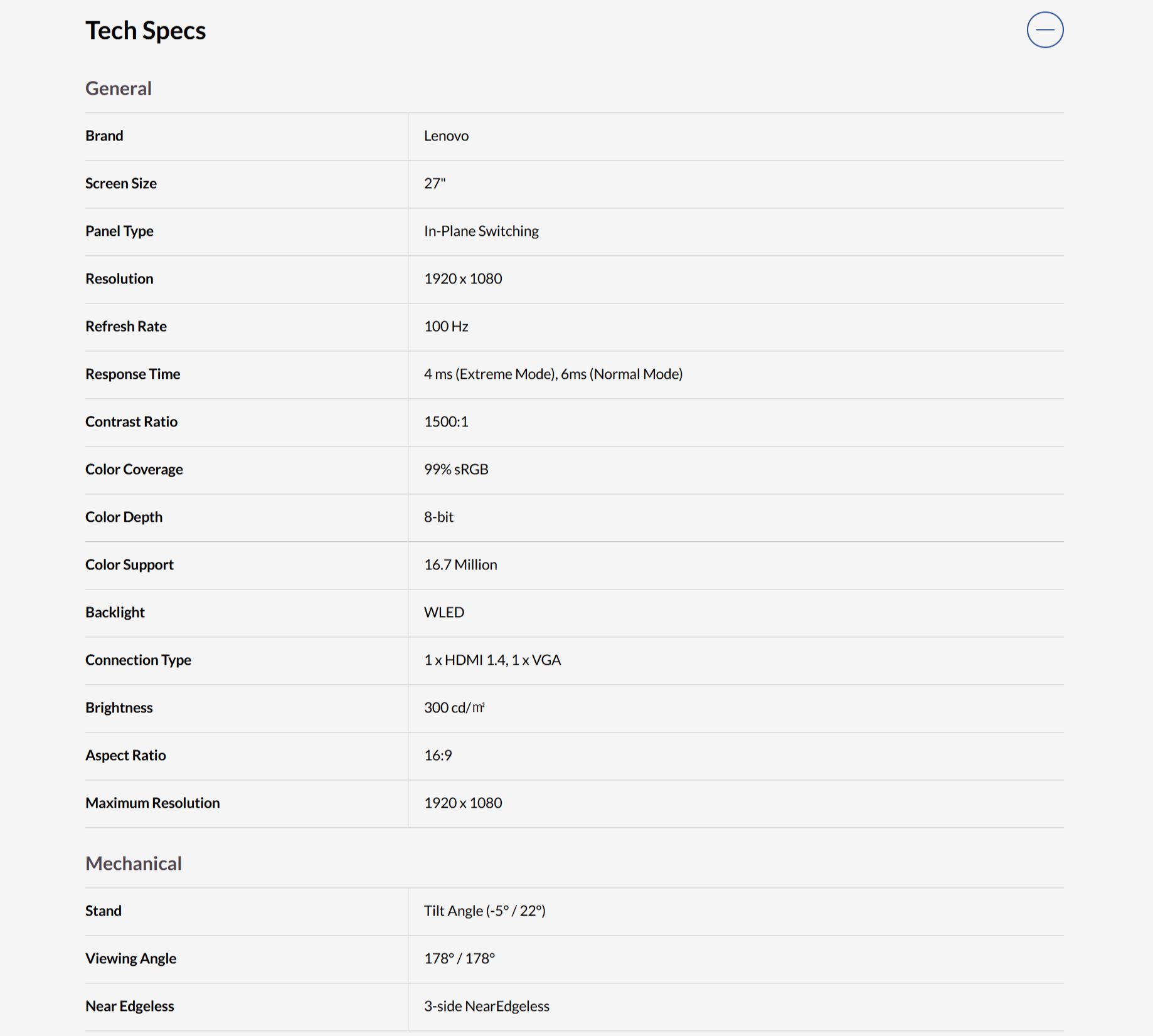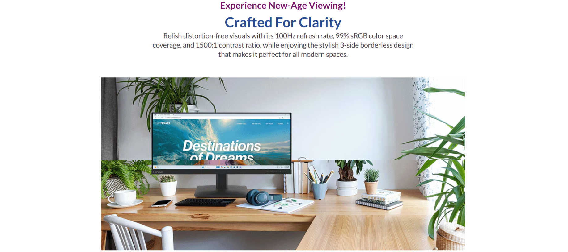 Lenovo L27-4e Monitor Experience new-age viewing! Crisp and clear image reproduction: level up your working experience with the 27", FHD monitor that displays clear and vibrant visuals. Discover enhanced comfort with truly smooth visuals on the display’s 100 Hz refresh rate. Practical and hassle-free connectivity: experience ease in connecting to your preferred peripherals and unlock boosted productivity for all your workflows. Enjoy compatibility and connectivity with all your devices using the HDMI or VGA ports. Environmentally sustainable packaging: choose a monitor with 100% paper boxes for its paper-based packaging that minimises environmental impact. Paper materials are often more readily recyclable and reusable, contributing to a reduction in waste and harmful byproducts.
