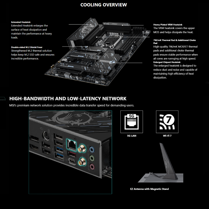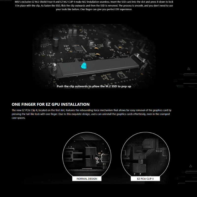 Frozr Guard: Extended Heatsink, MOSFET thermal pads rated for 7W/mK, additional choke thermal pads and EZ M.2 Shield Frozr II are built for high performance system and non-stop experience