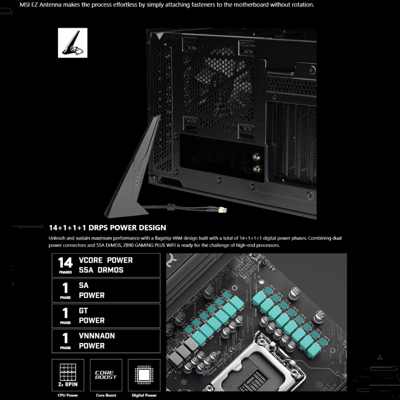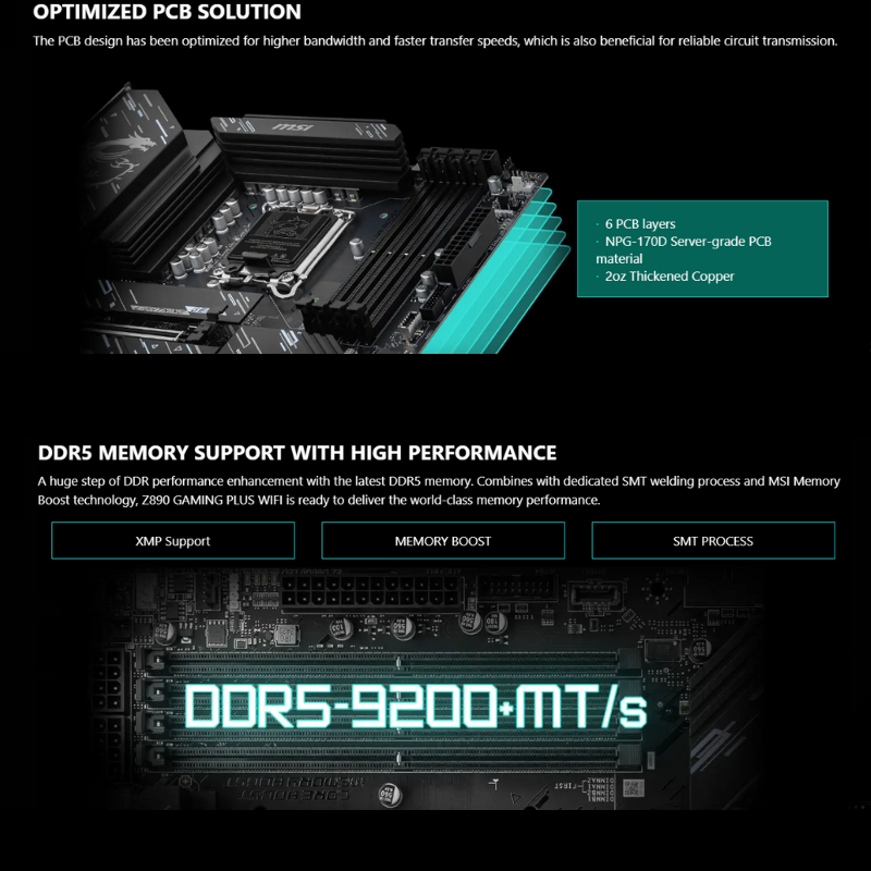 Ultra Performance: 14+1+1+1 Duet Rail Power System 55A DrMOS, dual 8-pin CPU power connectors, Core Boost, Memory Boost, 6-layer PCB made by 2oz thickened copper and server-grade level material