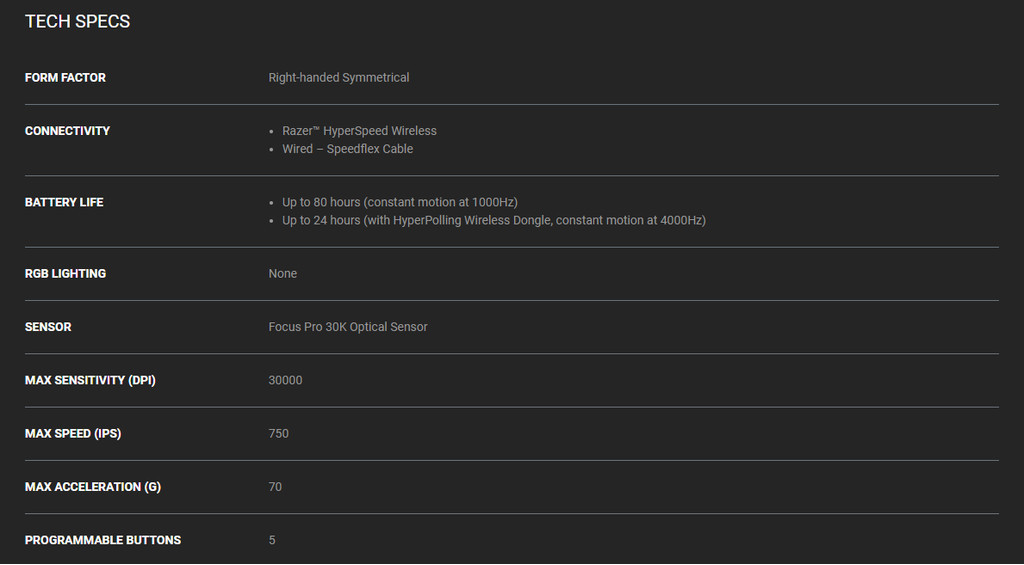 BATTERY LIFE: Up to 80 hours (constant motion at 1000Hz) + Up to 24 hours (with HyperPolling Wireless Dongle, constant motion at 4000Hz)