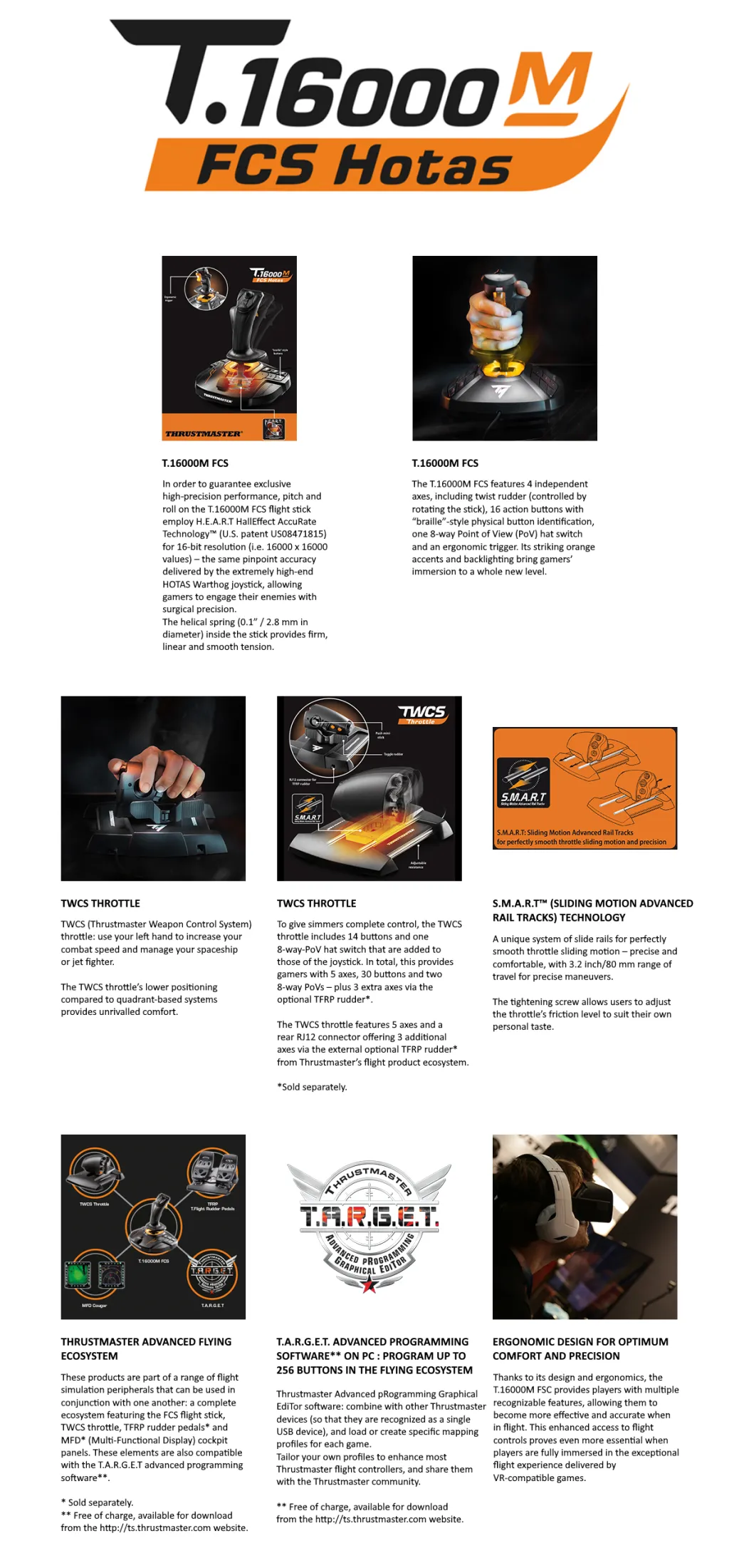 HOTAS joystick: precision and all controls at your fingertips T.16000M FCS (Flight Control System) flight stick featuring H.E.A.R.T magnetic precision technology + TWCS (Thrustmaster Weapon Control System) throttle featuring S.M.A.R.T technology Intuitive and natural: feels just like sitting in the cockpit!
