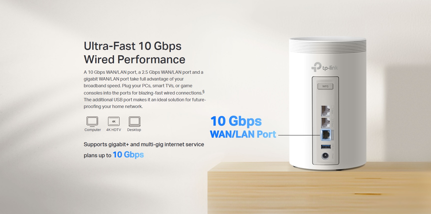 * Unprecedented 10 Gbps Network – 1× 10 Gbps WAN/LAN port + 1× 2.5 Gbps WAN/LAN port + 1× 1.0 Gbps port ensure max flexibility and boosted throughput.§