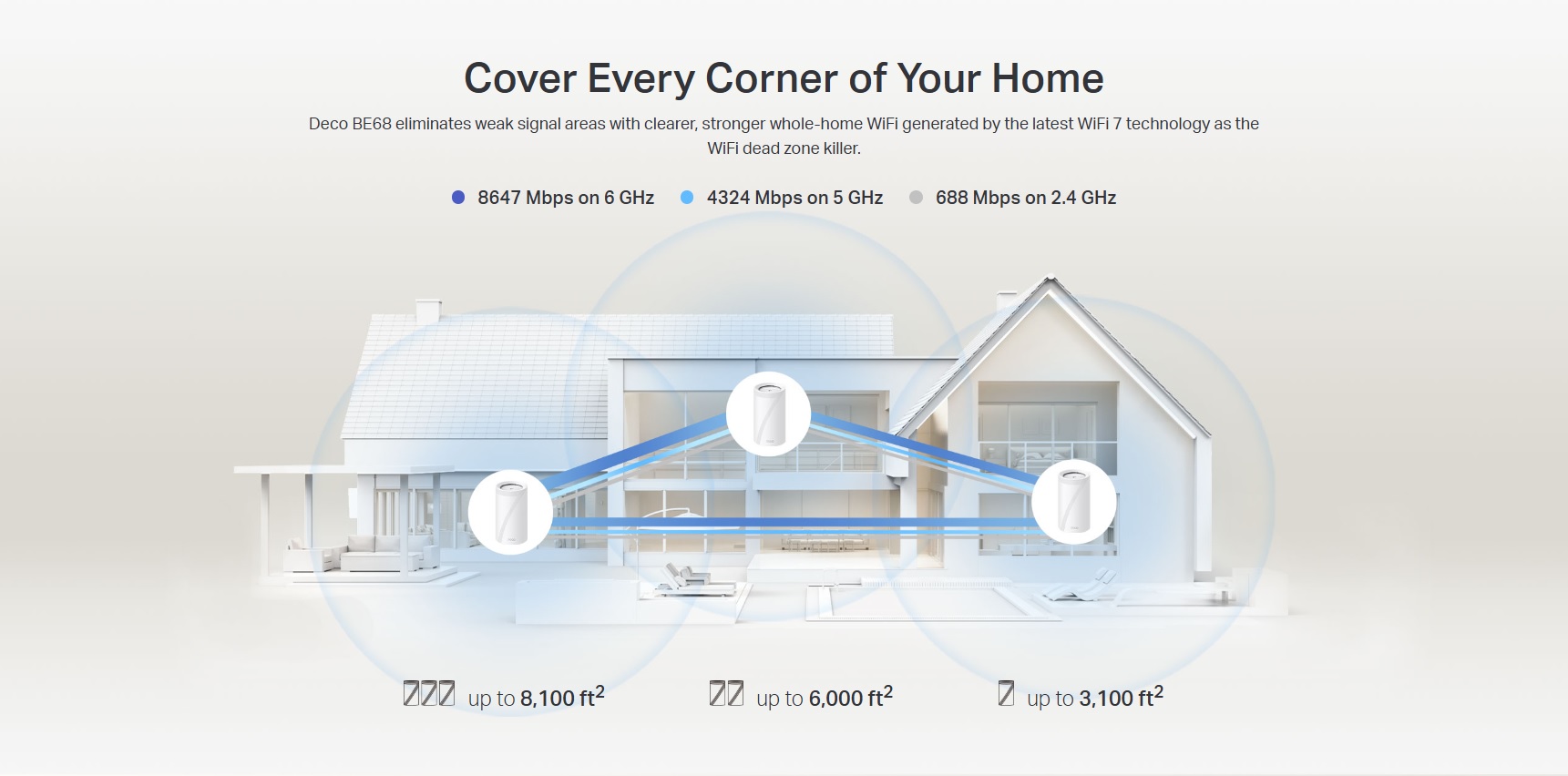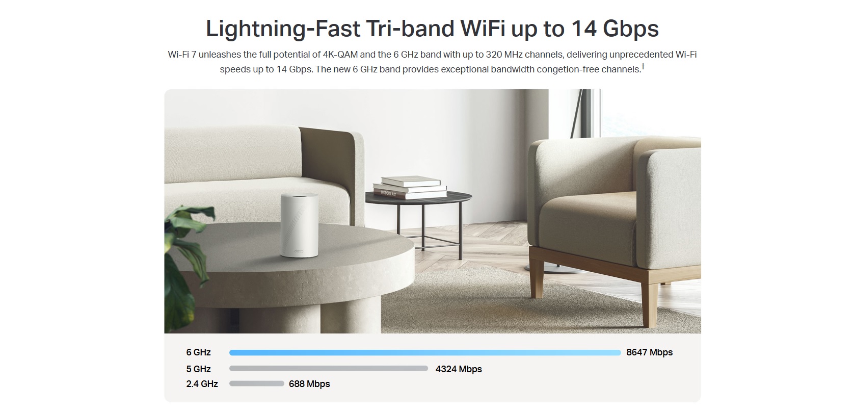 * 8-Stream 14 Gbps Tri-Band WiFi – 8647 Mbps (6 GHz) + 4324 Mbps (5 GHz) + 688 Mbps (2.4 GHz).†
