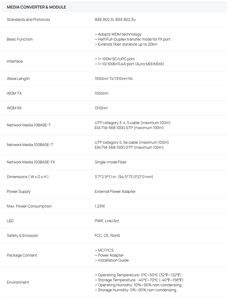 Complies with 802.3u 10/100Base-TX, 100Base-FX standards